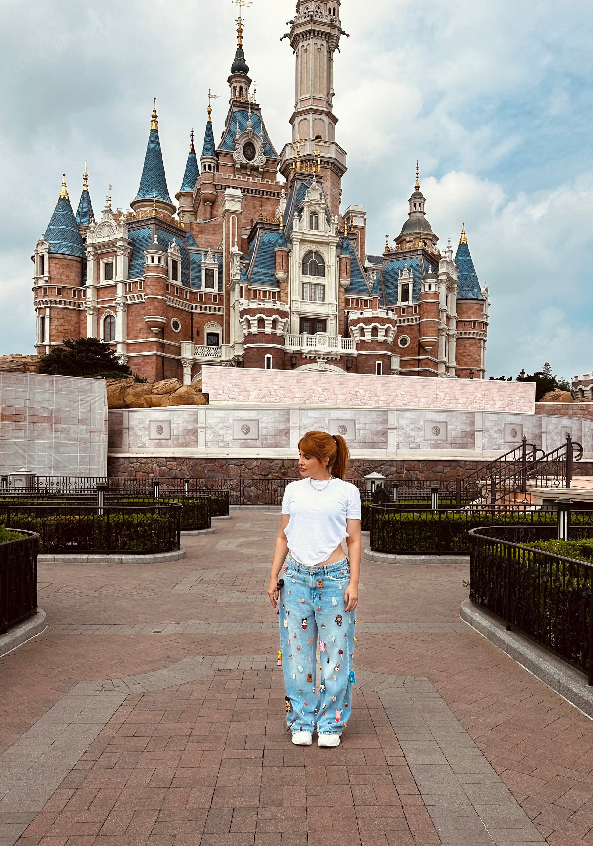 Uma calça jeans Personalizada com pingentes sortidos e pontos de luz em cristais Swarovski.