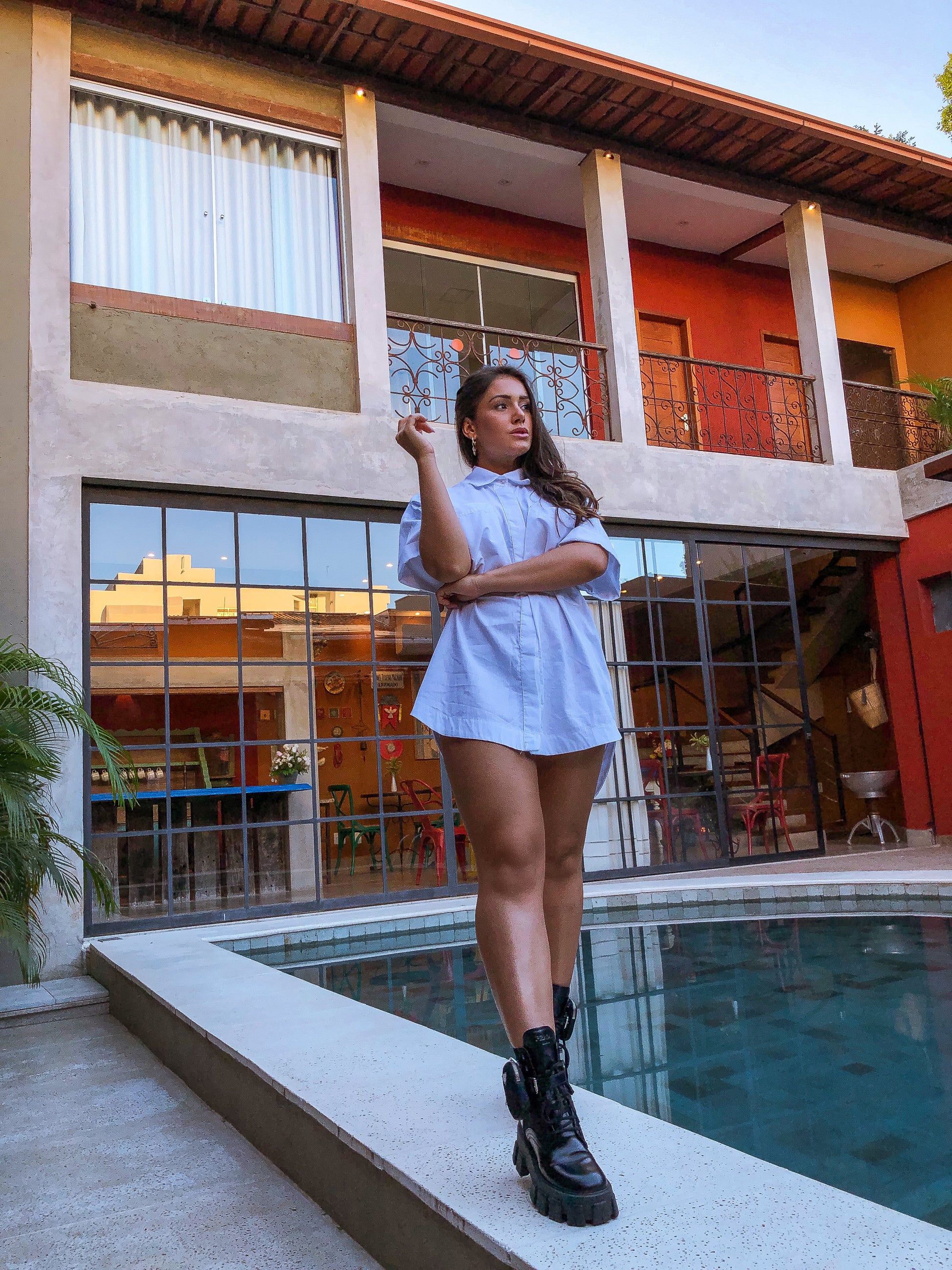 Camisa oversize de colarinho e manga curta com acabamento em dobra. Bolsos de patch na na frente. Parte inferior assimétrica. Detalhe de elástico atrás. Fecho frontal com botões ocultos na aba.