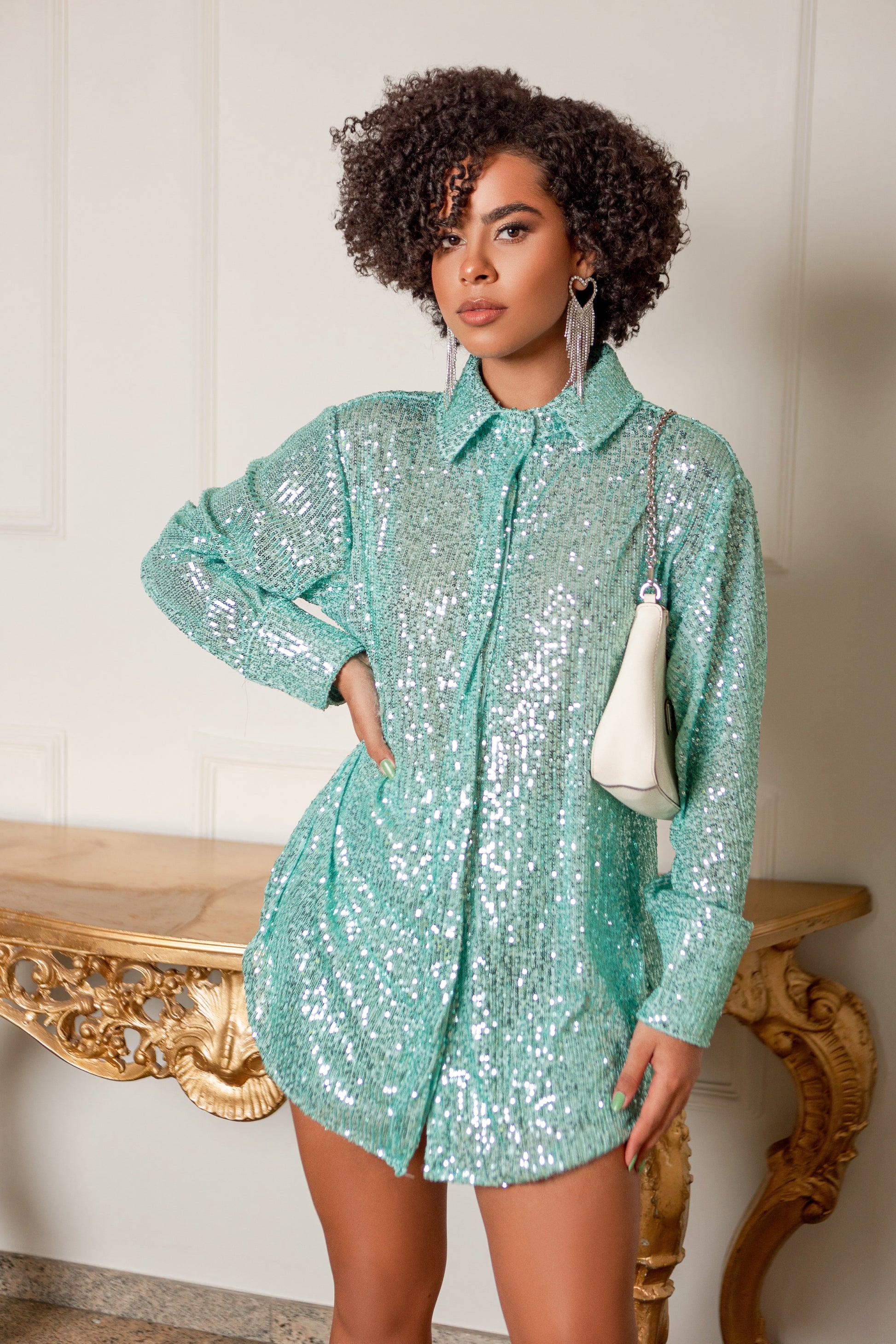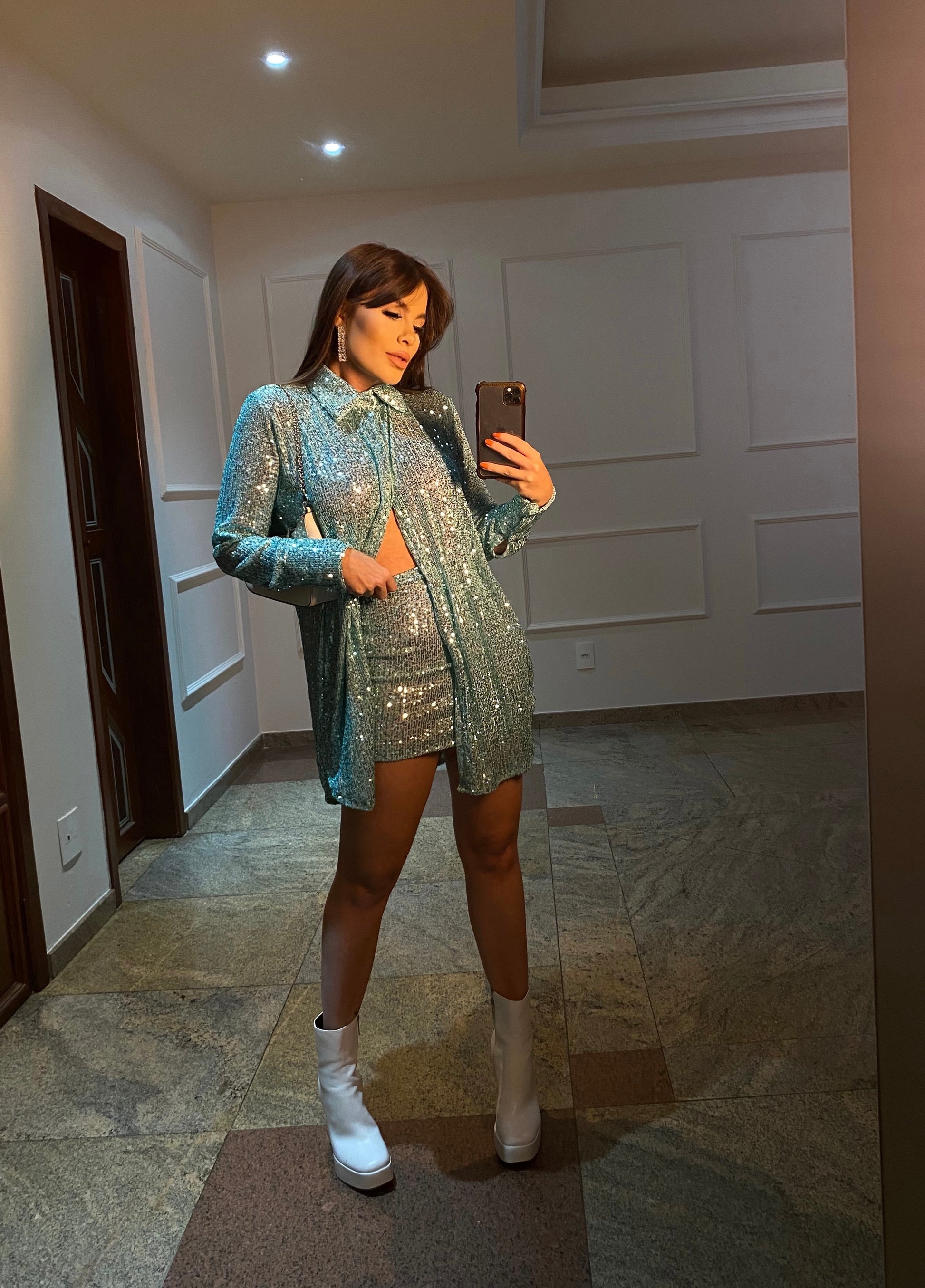 Nossa camisa social de paete acompanha saia no mesmo tecido .