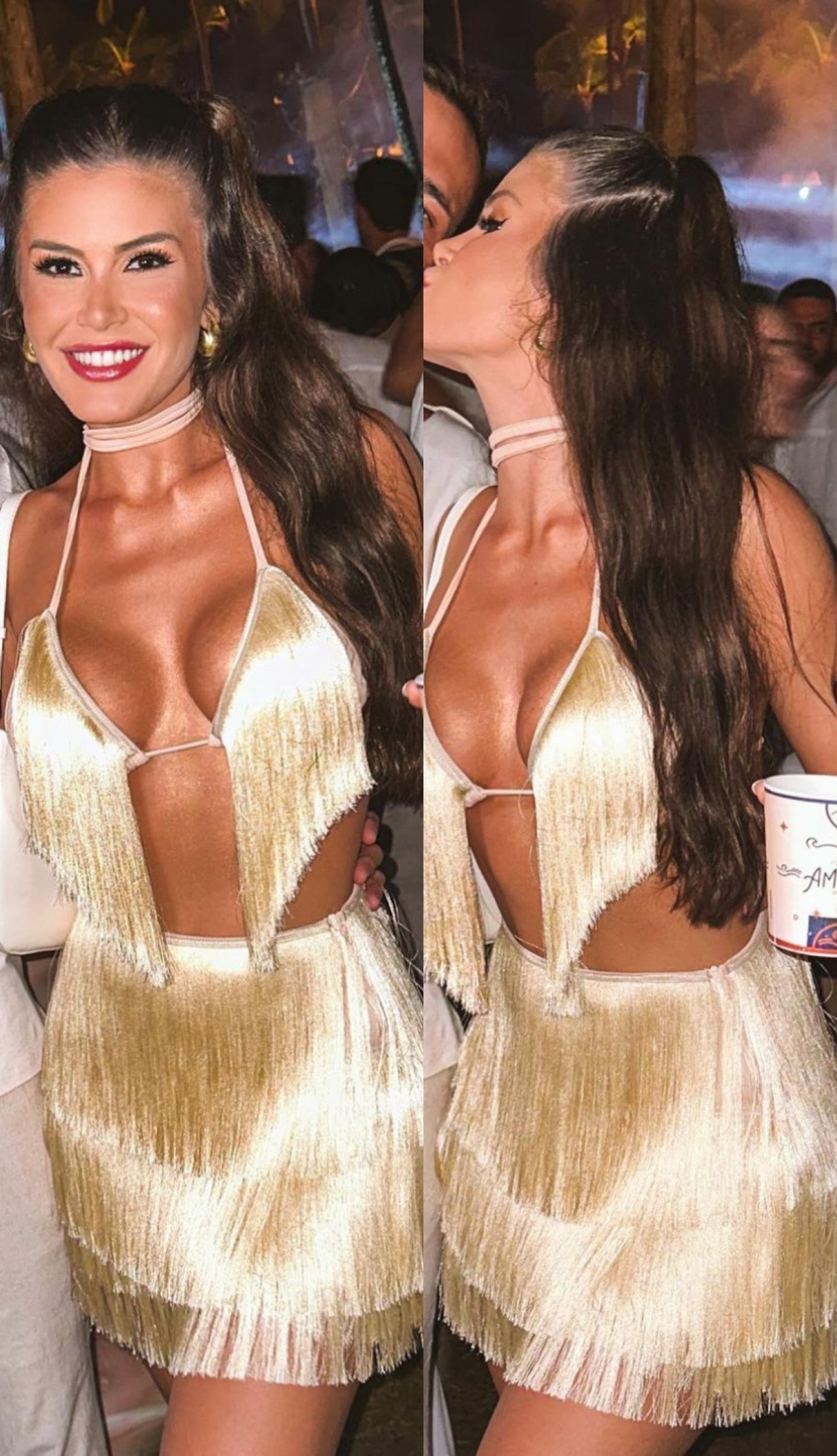 Confeccionado em franja de seda. Esse conjunto acompanha cropped e saia.