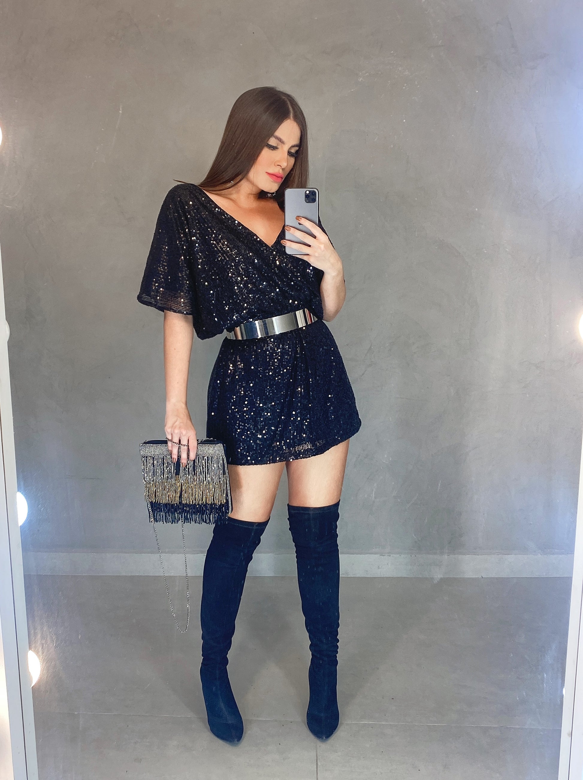 Confeccionado com tecido paetês, acompanha faixa no mesmo tecido para amarração para delinear a cintura .
