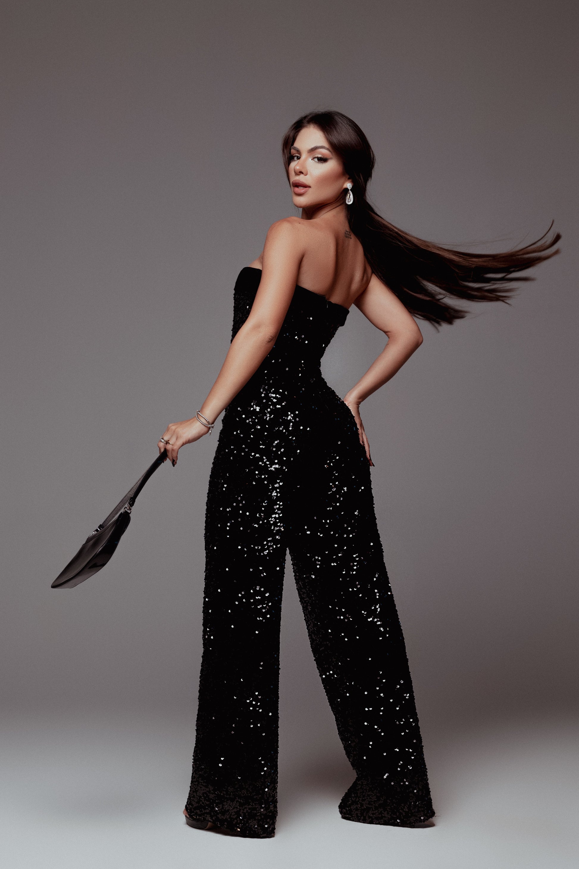 Esse macacão com decote sem alça é confeccionado em um dos paetês importados mais bonitos que você irá ver, cheio e brilhante.