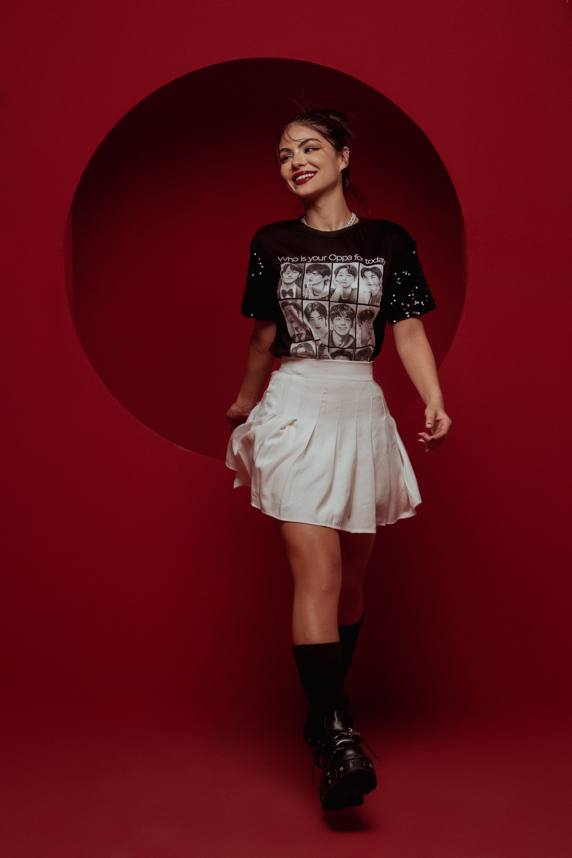 Tshirt Oppa mangas bordadas com paetês importados e branca sem bordado.