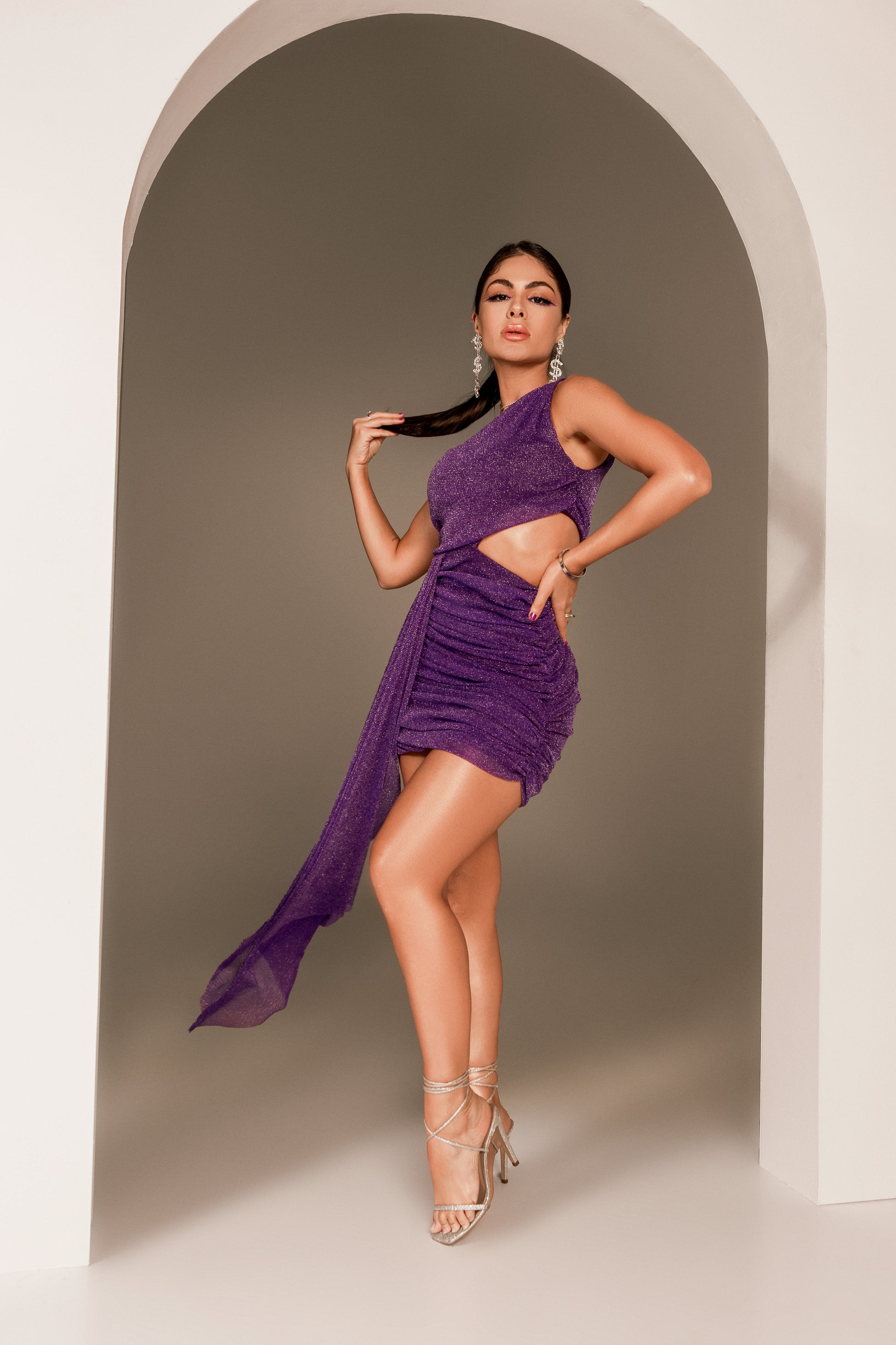 Vestido em tule lurex com partículas de brilho, calda lateral que da todo charme e elegância .