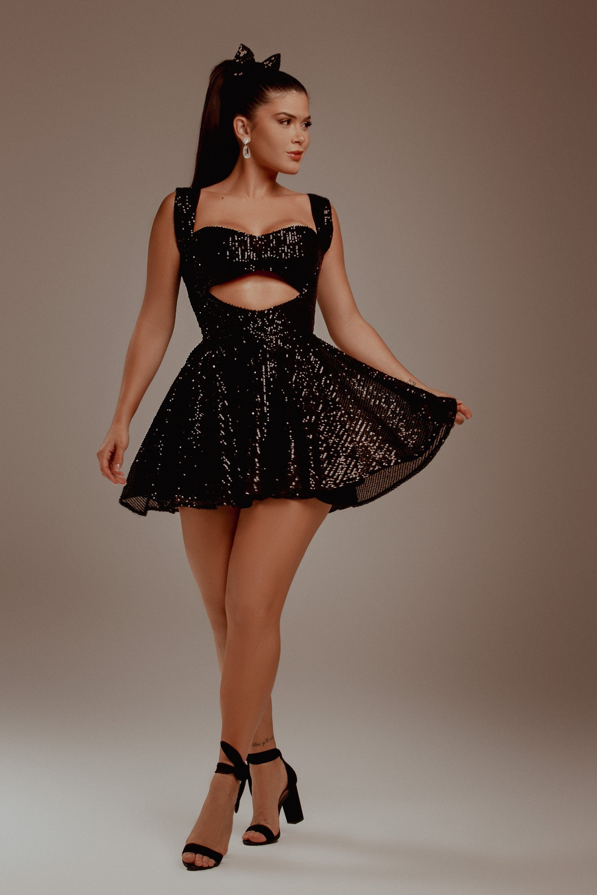 Vestido confeccionado em paetês importado cortado em gode.