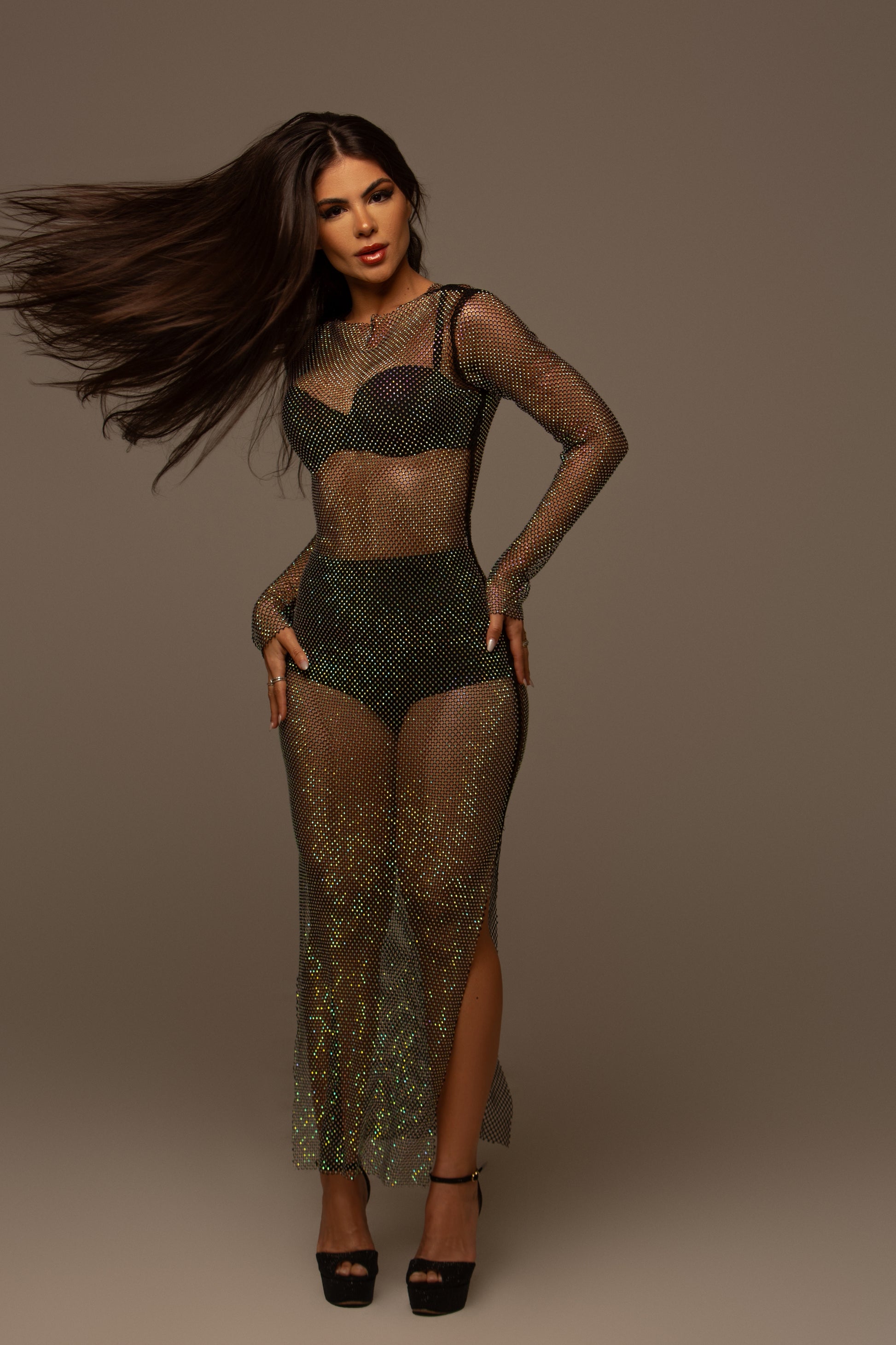 Vestido Midi com fenda pequena nas laterais todo cravejado em pedras/strass verdadeiro cor boreal.