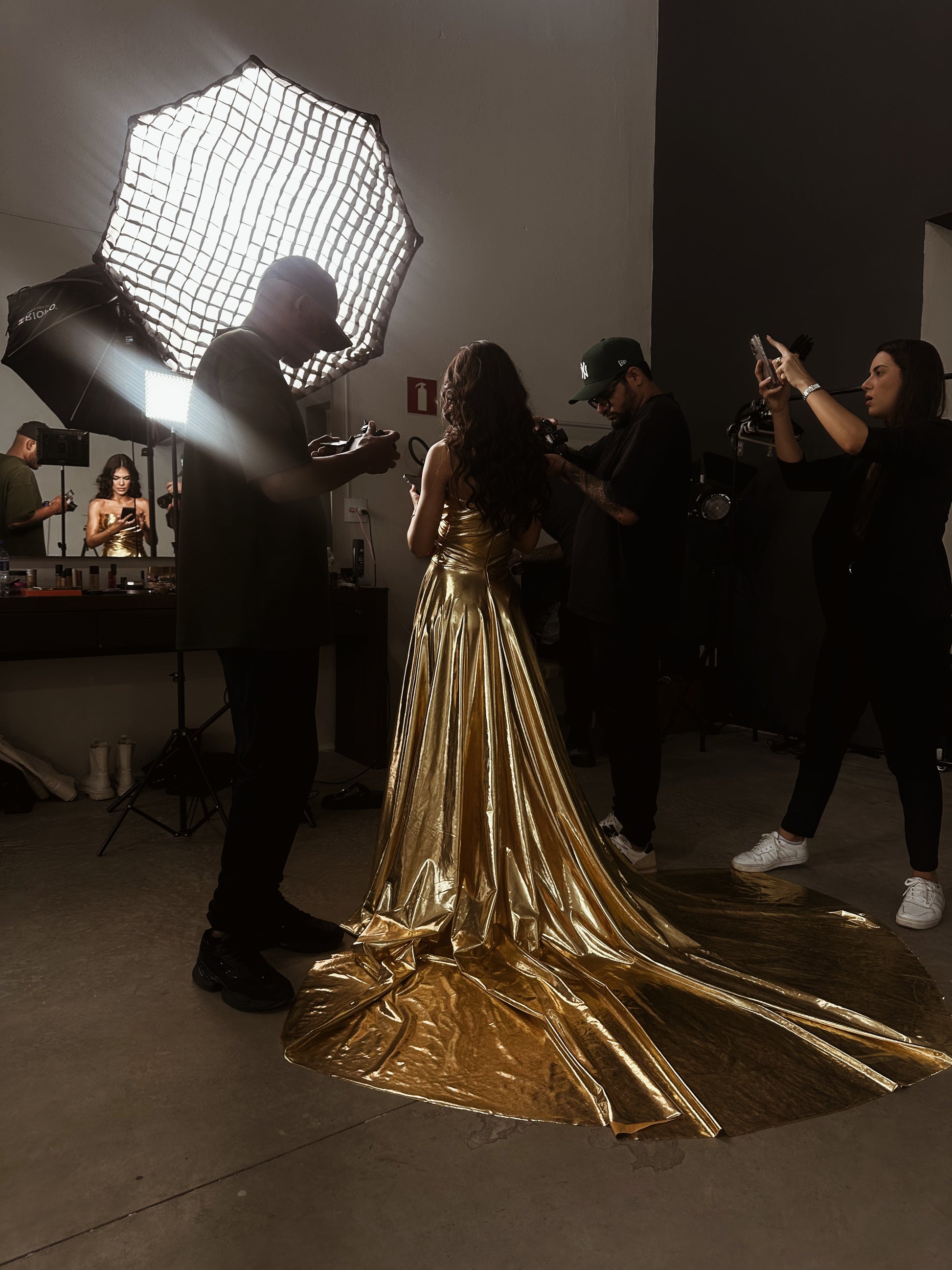 Nosso vestido Atenas feito com mais de 10 metros de tecido em malha metalizada .